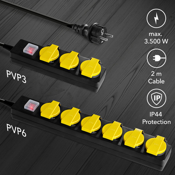 Nadalje, postoje modeli koji su prikladni i za privremenu vanjsku upotrebu, sa zaštitom IP44 i zaštitnim poklopcima koji se sami zatvaraju, poput naših crnih PVP3 / PVP6 produžnih utičnica. One dobro funkcioniraju čak i u težim uvjetima, poput radionica i vrtova.