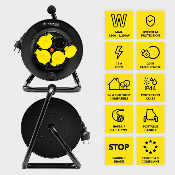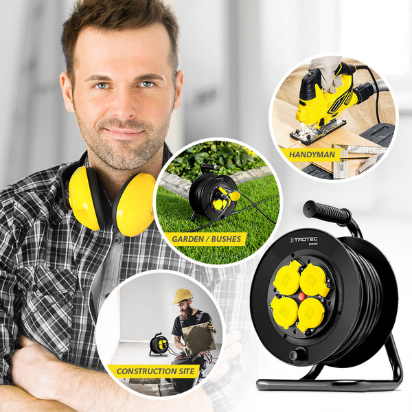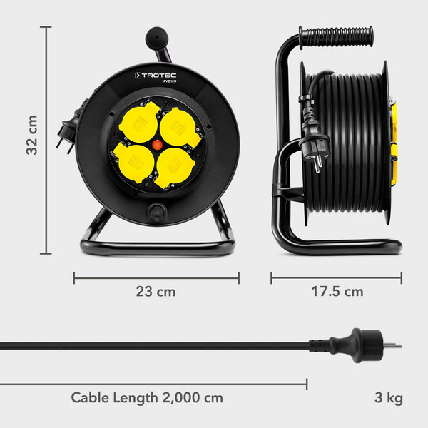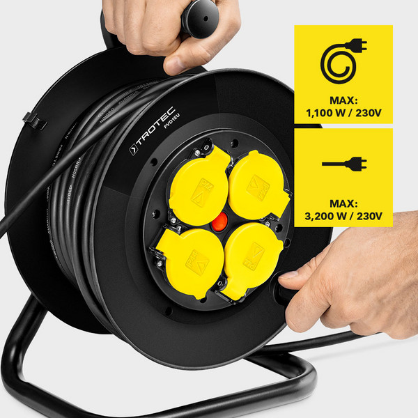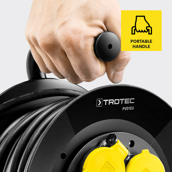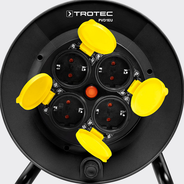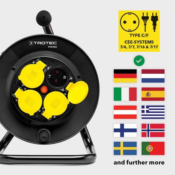 Prilikom spajanja na napajanje trebali biste biti na sigurno i stoga se odlučiti za robusni kolut za kabel PVD1EU u provjerenoj Trotec kvaliteti. Bubanj, koji je opremljen europskim utičnicama tipa C/F (CEE sustav 7/4, 7/7, 7/16, 7/17) i mrežnim utikačima (hibridnim utikačima) tipa CEE 7/7, može se bez problema koristiti u većini europskih zemalja.