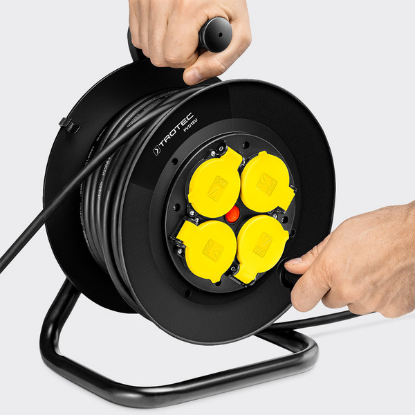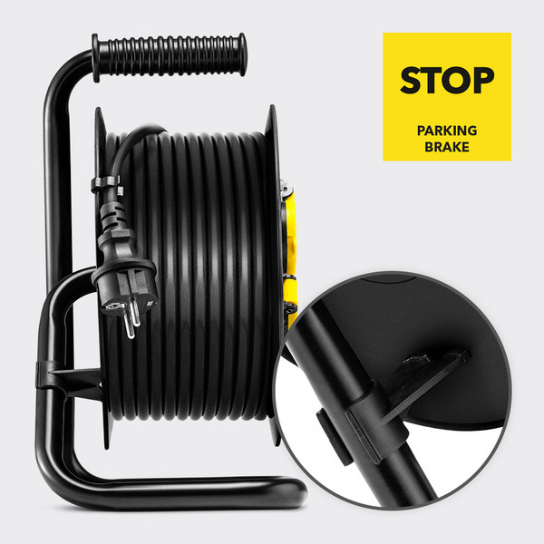 Čak i na velikim udaljenostima, idealan položaj ručke olakšava transport do radnog mjesta, gdje se može sigurno postaviti zahvaljujući širokim točkama oslonca. Prilikom premještanja ili skladištenja, držač kabela također omogućuje sigurno spremanje utikača. Zajedno s promjenjivo podesivim nosačem kočnice za osiguranje koluta, opasnosti od spoticanja uzrokovane odmotavanjem kabela su stvar prošlosti.