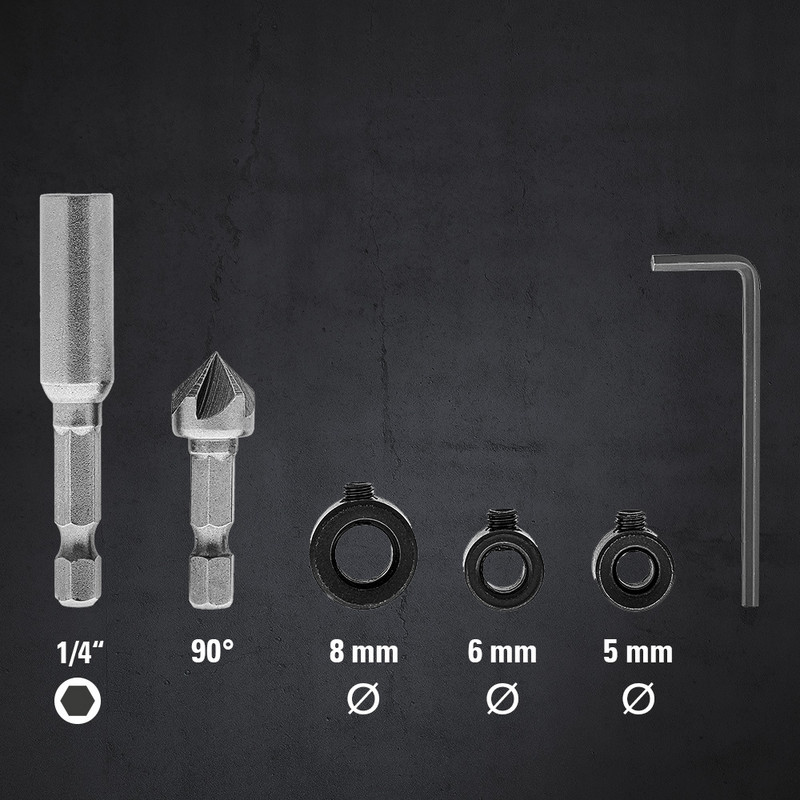 - 3 x kontinuirano podesivi zaustavni prstenovi za dubinu, 1 x upuštač, 1 x magnetski držač bita, 1 x imbus ključ