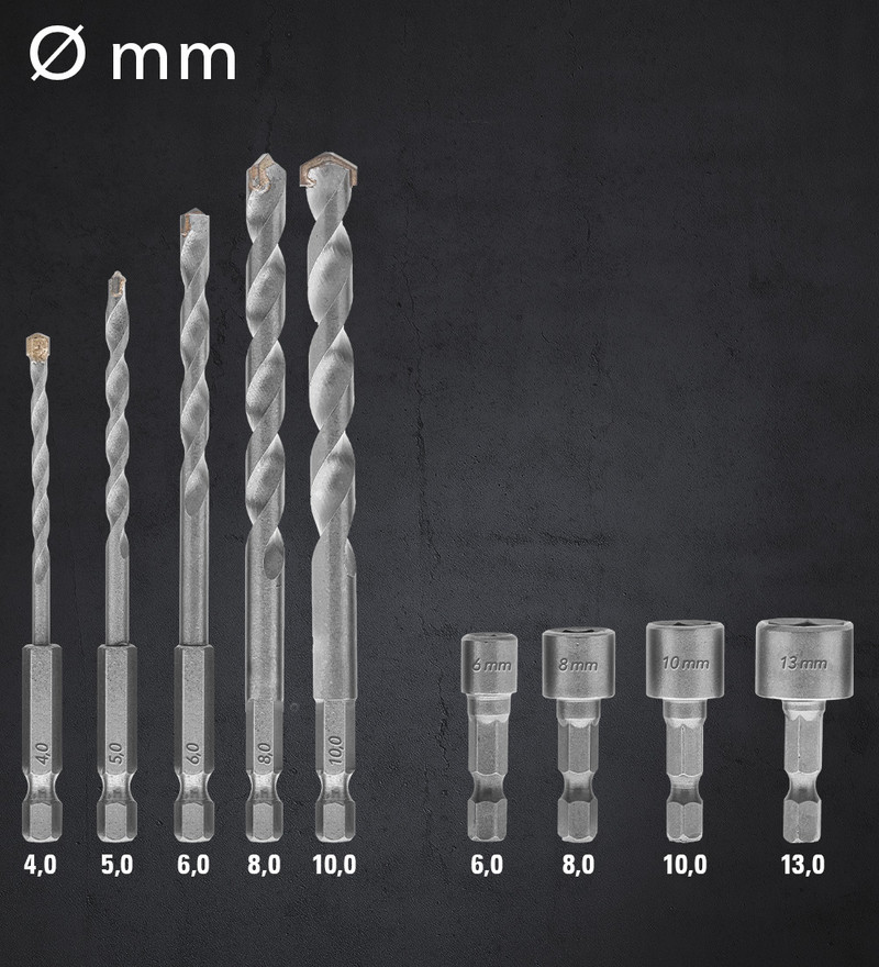 Nije važno bušite li čiste rupe u betonskim zidovima, zidovima od gipsanih ploča, drvenim podnim pločama ili metalnim pločama, a zatim uvijate vijak pravim nastavkom. Ili želite izbušiti rupe u metalnim kutovima ili drvenim pločama kako bi se mogli montirati sigurnim vijčanim spojem. Ovi i mnogi drugi poslovi bušenja i uvrtanja omogućeni su pomoću vijaka i nastavka u kombinaciji s komercijalno dostupnim alatima sa šesterokutnim nosačima. Praktična stvar ovog kompleta je da ne morate brinuti o prikladnim svrdlima, bitovima ili nasadima. U set su također uključeni najčešći promjeri bušenja za obradu drva, metala i kamena, kao i široka paleta bitova s najčešćim vijčanim pogonima (prorezani, Phillips i Torx) i nasadnim ključevima u najvažnijim veličinama ključeva.
