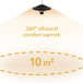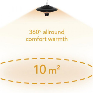S lancem od nehrđajućeg čelika dužine 50 cm koji je uključen u isporuku, svjetlosni infracrveni grijač od 1,5 kg može se u nekoliko jednostavnih koraka ugraditi kako bi se uštedjelo mjesto na stropu, krovovima terasa ili okvirima šatora, čak i bez potrebe za električarem. Uz svoj elegantni crni dizajn, stropni reflektor postiže moćnu i štedljivu infracrvenu tehnologiju grijanja. Karbonska infracrvena cijev snage do 1500 vata pruža trenutnu toplinu koja se ravnomjerno zrači u svim smjerovima za površinu od približno 10 m² bez prethodnog zagrijavanja. Ova ugodna infracrvena toplina odmah se primjećuje na koži bez prethodnog zagrijavanja okolnog zraka i potpuno bez neugodnih mirisa ili buke.