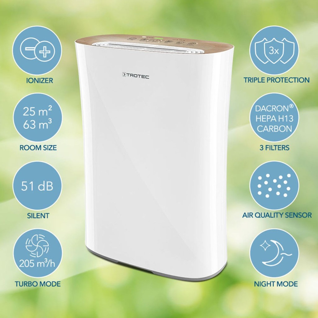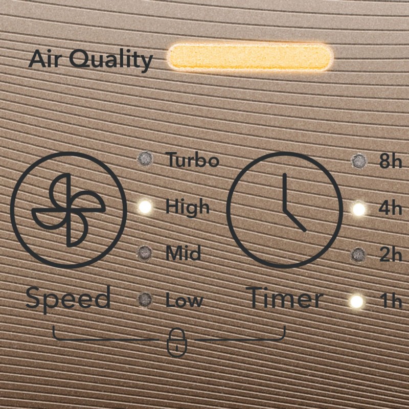 Sa zaobljenim uglovima i udubljenim, unutra zakrivljenim oblikom kućišta, 110 E izgleda elegantno. Zlatna površina upravljačke ploče stvara visokokvalitetni kontrast bijeloj boji. Jednako je impresivna i komforna oprema 110 E, koja dolazi s trostupanjskom tehnologijom HEPA filtra (H13 prema ISO 29463) i svijetlim zaslonom za prikaz kvalitete zraka. Visoku razinu korisničke udobnosti AirgoClean® 110 E nadopunjuju tri načina rada (automatski način rada s otkrivanjem svjetla, turbo način rada, noćni način rada), indikator promjene filtra, funkcija tajmera i zaštita djece za rad bez nadzora.