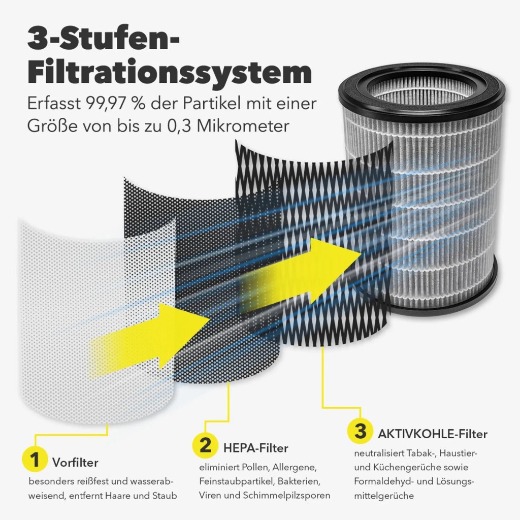 Sustav filtriranja 3 u 1 AirgoClean® 170+ pokriva tri kategorije. Predfilter od sintetičkih vlakana zadržava veće čestice poput dlaka kućnih ljubimaca, vlakana i grube kućne prašine, čime se produžuje vijek trajanja sljedećih filtera. HEPA filter uklanja čestice veličine do 0,3 mikrometra s učinkovitošću od 99,97% - uključujući pelud, finu prašinu (PM2,5), spore plijesni, ostatke grinja kućne prašine, bakterije i viruse. Filter s aktivnim ugljenom adsorbira mirise i hlapljive organske spojeve (VOC) poput duhanskog dima, formaldehida i mirisa kuhanja ili kućnih ljubimaca.
