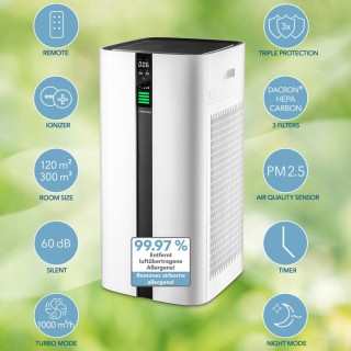 Zaštitite sebe i svoje najmilije HEPA filtriranim zrakom koji je 99,97% bez štetnih čestica i zagađivača u zraku. Potpuno automatski zahvaljujući najsuvremenijim "Senzorima kvalitete zraka". Senzori AirgoClean® 350 E kontinuirano mjere temperaturu, vlažnost, kvalitetu zraka i opterećenje mikročestica u zraku prostorije kako bi ga očistili inteligentno kontroliranim izlaz zraka po potrebi.Četiri stupnja ventilacije s jednim Turbo načinom rada i snažnom cirkulacijom zraka od 1.000 m³/h omogućuju primjetno poboljšanje kvalitete zraka u najkraćem mogućem vremenu.Najbolji uvjeti za zdrav dom ili vrijeme bez stresa na raditi.