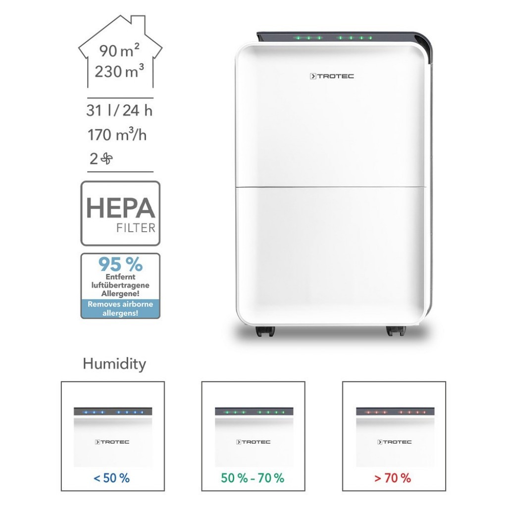 Povjerite zaštitu svog zdravlja, nadzora kvaliteta zraka u objektima iu zatvorenom prostoru TTK 99 HEPA odvlaživaču zraka sa visoko učinkovitom HEPA tehnologijom pročišćavanja zraka s lakoćom i praktičnošću. Sa svojom kombiniranom tehnologijom pročišćavanja zraka i odvlaživanja, svestrani uređaj pouzdano sprječava stvaranje nezdravih džepova vlage i povezanih problema s vlagom kao što su rast plijesni, mrlje plijesni i vlaga. Zrak u prostoriji se oslobađa od aerosola koji nose viruse, virusa (npr. SARS-CoV-2 i virusa gripe), bakterija, spora plijesni, fine prašine, kućne prašine, životinjske dlake i drugih patogena u zraku u sistemu dvostrukog filtera koji se sastoji od pred. -filter i visoko efikasan HEPA filter. Smanjuje se i rast grinja i alergena. Čista stvar.