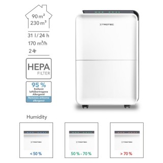 Ako vlaga u privatnom stambenom prostoru, u garaži ili na poslu postane zdravstveni problem, odvlaživač zraka TTK 99 HEPA pouzdano i trajno osigurava zdravu klimu u zatvorenom prostoru. Zahvaljujući visokom kapacitetu odvlaživanja od 31 litara dnevno, što nije izazov u ovoj klasi uređaja, mobilni odvlaživač se preporučuje za prostorije veličine do 90 m² ili 230 m³. Sa svojim visokim učinkom zraka od 170 m³/h, kompaktna elektrana čak svladava isušivanje vlažnog zida, na primjer nakon jake kiše ili poplave - i ni na koji način nije inferiorna od klasičnih građevinskih sušara. Vizualno, TTK 99 HEPA impresionira svojim modernim dizajnom, crnom kontrolnom pločom i ručkama za nošenje ugrađenim u kućište za brzu promjenu lokacije.