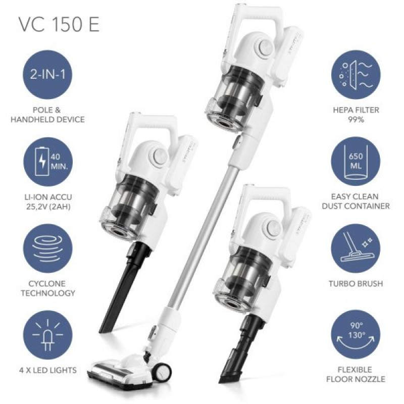 Kad je potpuno napunjena, snažna litij-ionska baterija od 25,2 V (2 Ah) osigurava konstantnu visoku snagu usisavanja tijekom 40 minuta u kontinuiranom radu. S dvostupanjskim prikazom kapaciteta baterije uvijek imate na oku status napunjenosti. Zahvaljujući visokokvalitetnoj tehnologiji Li-Ion baterija nema memorijskih efekata niti samopražnjenja. Podna mlaznica je u prednjem dijelu opremljena s četiri LED svjetiljke pomoću kojih se tamna područja ispod sofe ili ispod ormara mogu savršeno osvijetliti. Opseg isporuke uključuje ručni usisavač, jedinicu za napajanje, presvlaku, mlaznicu za namještaj i pukotine, električnu podnu mlaznicu, aluminijsku produžnu cijev i postavu za postavljanje. Zahvaljujući svom obliku koji štedi prostor, VC 150 može se udobno spremiti bilo gdje.
