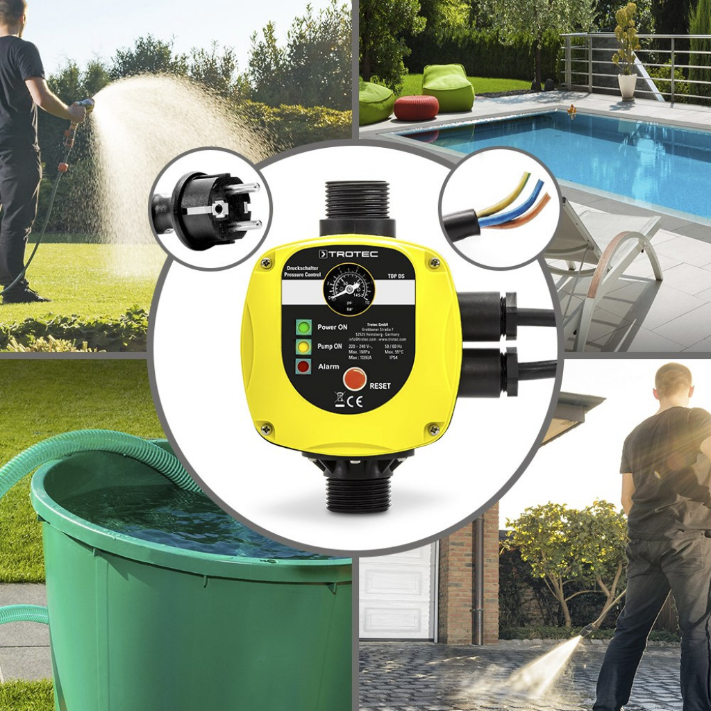 Elektronski tlačni prekidač TDP DS iz tvrtke Trotec pouzdano je rješenje za automatsko upravljanje crpkama dubokih bušotina, vrtnim crpkama, centrifugalnim crpkama ili crpkama vode bez vlastitog napajanja primjerice za navodnjavanje vrta, za vodoopskrbu, za crpljenje vode iz bazena ili za radove na čišćenju.