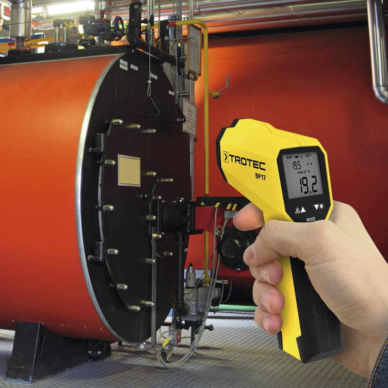Uz BP17 pirometar na raspolaganju imate pouzdan i precizan površinski termometar. Njegov infracrveni senzor omogućuje vam precizno očitavanje u širokom temperaturnom rasponu od -50 ° C do +380 ° C. Možete unaprijed postaviti referentnu temperaturu i vidjeti bilo kakva odstupanja s vizualnim i zvučnim alarmima. Kod postavljanja raspona tolerancije na raspolaganju imate između 1 ° C, 3 ° C i 5 ° C. Tako da možete iz daljine biti sigurni da stvarno bilježite trenutnu temperaturu uzorka, a ne vrijednost okoliša, pri nekontaktnom mjerenju površine, pirometar BP17 opremljen je ciljanim laserom koji pokazuje središte mjernog mjesta (optička razlučivost 10: 1). Imajte na umu da se mjerno mjesto, tj. Područje na kojem su zabilježene temperaturne vrijednosti, povećava s povećanjem udaljenosti.