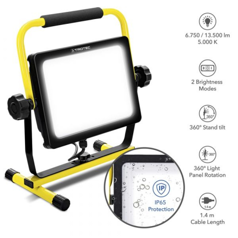 Građevinski reflektor, težak samo 2 kg, ima podesivi smjer svjetlosti, izoliranu ručku i podesivu bazu, kombinira izuzetno visoku svjetlosnu snagu i svestranost u najmanjem prostoru. Zahvaljujući visokom stupnju zaštite IP65, profesionalni reflektori također su idealni za vanjsku upotrebu u vjetru i vremenu. Sklopljen, lagan, opremljen naponskim kabelom duljine 1,4 m, udobno se uklapa u bilo koju futrolu za alat, tako da u trenu može pružiti dnevno jako svjetlo u lošim uvjetima osvjetljenja.
