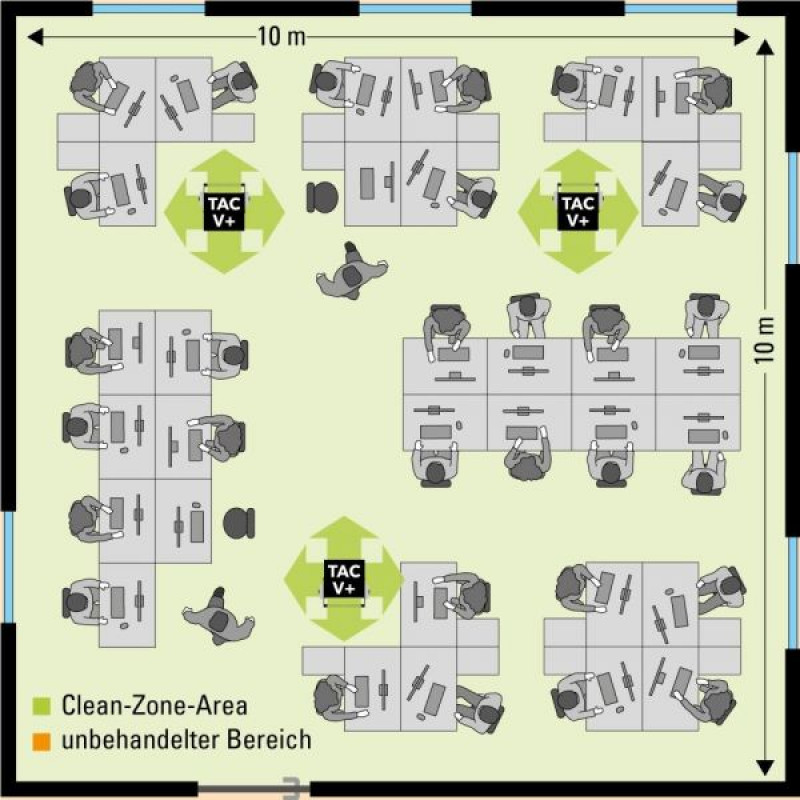 Na taj način, TAC V + značajno i sigurno smanjuje rizik od infekcije putem zraka u jako posjećenim javnim prostorima i jamči radne uvjete bez prašine u radnim područjima zagađenim prašinom: