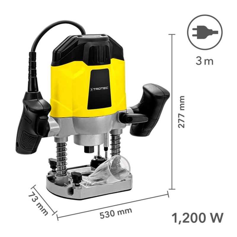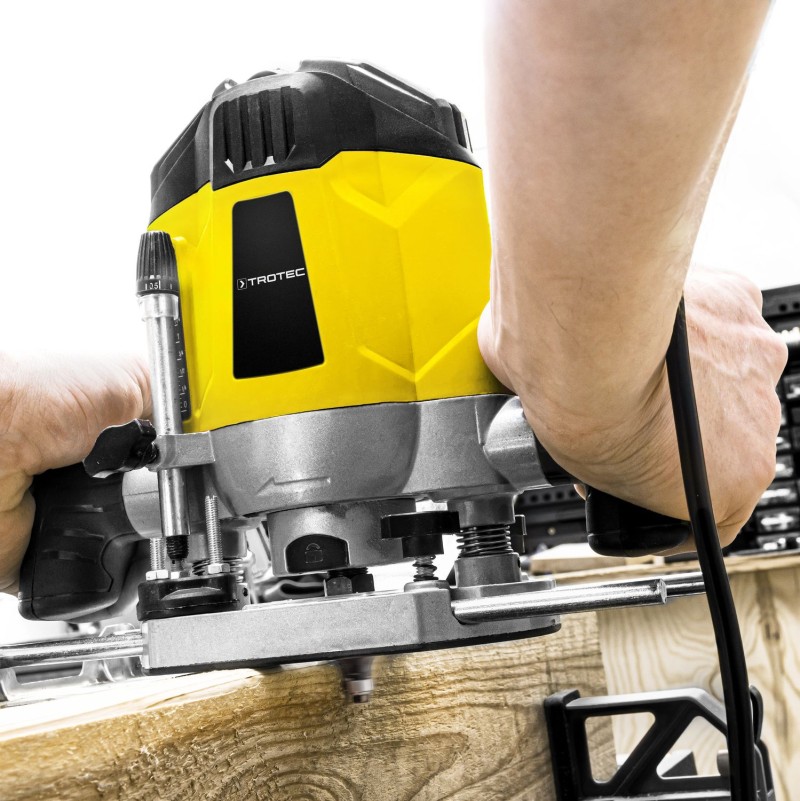 Dvije ergonomski oblikovane ručke jamče udobno rukovanje i vođenje alata bez umora, dok uravnoteženo težište kormila osigurava siguran oslonac i maksimalnu kontrolu u svakom trenutku. Za maksimalnu slobodu kretanja, ručna glodalica je opremljena kabelom za napajanje od 3 m. Dubina glodanja se postavlja praktično i jednostavno pomoću graničnika dubine podesivog po visini sa skalom i finim podešavanjem. Integrirani stepenasti graničnik ili graničnik kupole savršen je alat za postizanje većih dubina glodanja korak po korak. Zahvaljujući blokadi vretena, vrhovi alata se mogu brzo i jednostavno mijenjati.