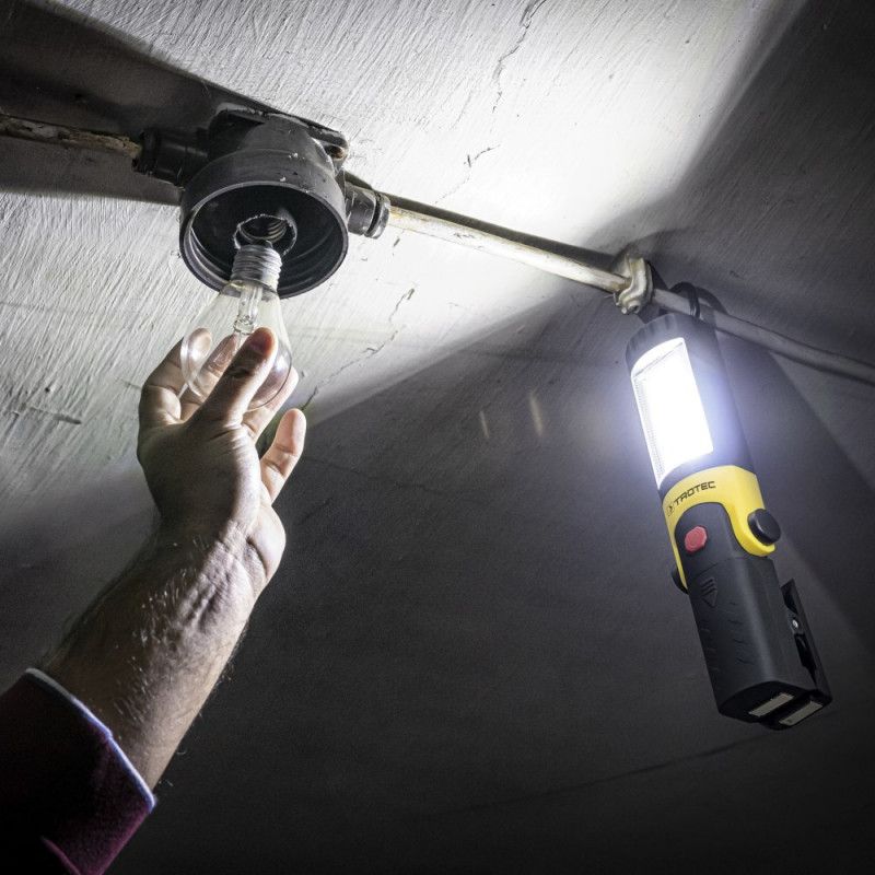 Tako da svoj posao možete ugodno ,i iznad svega , obaviti slobodnim rukama, bežična svjetiljka je opremljena preklopnom visećom kukom, moćnim kopčom za pričvršćivanje i integriranim magnetskim držačem. Možete objesiti svjetiljku, zakačiti je na dasku ili ljestve ili postaviti na metalne površine poput poklopca motora ili čelične skele. S ovim svestranim mogućnostima ugradnje svjetiljka se može pouzdano postaviti u svim položajima i u svim sredinama.