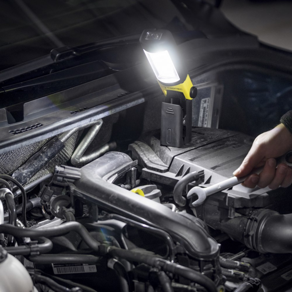 Usklađivanje svjetlosne glave usmjereno prema potrebama nudi savršene uvjete za najbolje moguće osvjetljenje i vidljivost. To se može zakretati za 90 ° i dodatno zakretati za 270 ° po želji, tako da se unutarnja ili vanjska površina mogu lako osvijetliti i do najudaljenijeg kuta. Posebno, kada radite u skučenim prostorima ili u uvjetima koji su već teški primjerice rad na automobilu.