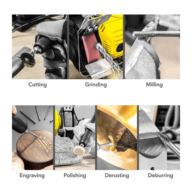 Ravni utorni navoj, kuglasti vrh i konusni glodala od ugljičnog čelika prikladni su za glatko urezivanje ili glodanje, kao i za udubljivanje i udubljenje. Sadrži 2 vrha za graviranje s dijamantnim vrhom za grublje do vrlo delikatno graviranje. Vrhovi za graviranje mogu se koristiti za materijale od drva, keramike, stakla, metala, kože i drugih materijala.